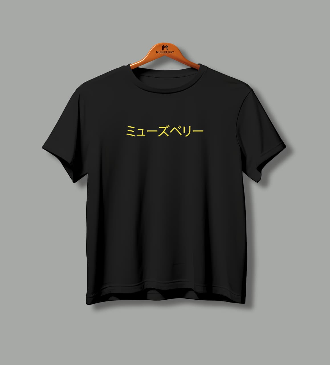 Minimal, modern, and effortlessly stylish — this premium black t-shirt features brand name Museburry written in sleek Japanese Katakana script. The golden-yellow print creates a striking contrast against the black base, giving it a bold streetwear vibe with a touch of cultural flair.